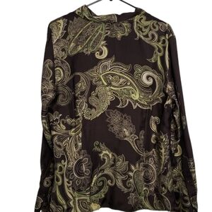 Ann Taylor Women's Paisley Silk Blouse Brown Green Button Front Ruffle Size 16