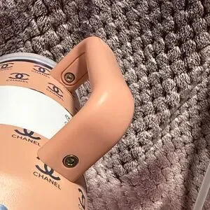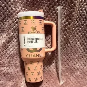 Elegant peach tumbler featuring CHANEL logo. Comes with a straw. Irridescent border. Comes with Box.