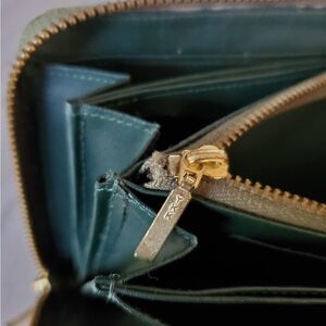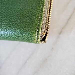Vintage Enrico branded genuine leather zipper closure wallet. Beautiful green pebbled leather with gold tone hardware. Interior features 8 full length slip pockets and a center zipper pocket. Good vintage condition with some wear on the corners, discoloration on the leather and oxidation on the metal hardware (see photos). Measures approximately 8” x 4.5”
