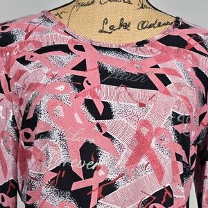 Keywords: breast cancer awareness, pink ribbon, support, hope, empowerment, long sleeve, graphic print, casual, everyday wear, charity event, statement top, feminine details