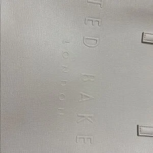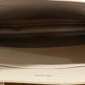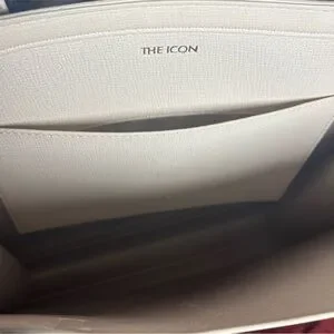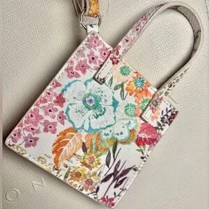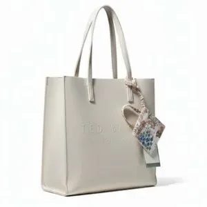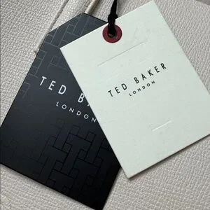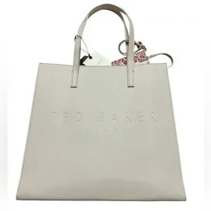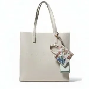 NWT Chic cream tote by Ted Baker. Features a floral charm mini bag card holder with two slots, embossed logo front and back, made of durable polyurethane, unlined interior, one interior pocket. 13.5x13.5”, handle drop 9”.