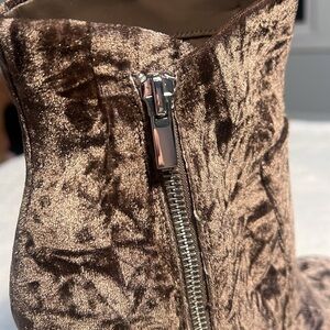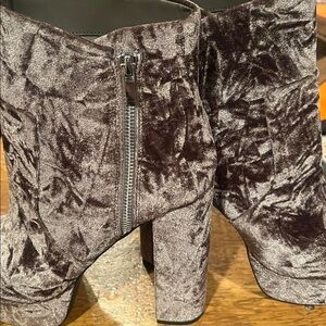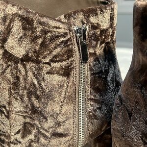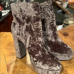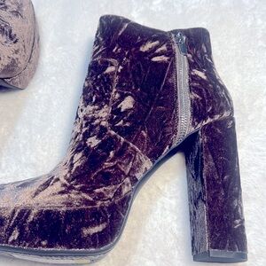 Step into vintage-inspired glam with these brand new Gianni Bini velvet platform boots in size 10. Made with luxe crushed velvet in a rich brown hue, these ankle boots feature a bold chunky block heel, high platform sole, and an easy side zip closure. The Didier style is a standout piece—perfect for festivals, parties, or making a fashion-forward statement.
