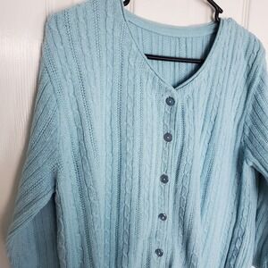 Vtg Sky Blue Sweater Knit 3/4 Sleeve Button Up Scandi Grandma Cottage Teacher XL