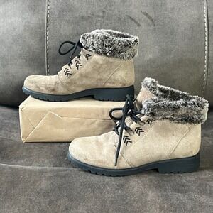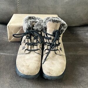 Cobbler Cuddlers boots, women's size 7 boots, faux fur ankle boots, tan suede lace up boots, cozy winter footwear, comfort walking boots, cold weather shoes, faux fur lined boots, suede hiking style boots, women's casual boots