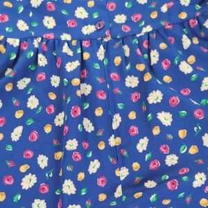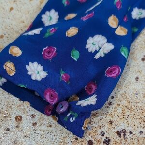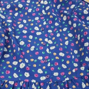 This adorable sundress showcases a delightful floral pattern in shades of blue and pink. It features a peter pan collar and 3/4 bishop sleeves, offering a blend of elegance and comfort. The dress's midi length and relaxed fit make it ideal for a laid-back day out. Button and zip closure in the back.