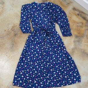 Vintage | Floral Blue Midi Dress with 3/4 Sleeves and Lace Collar Size 8
