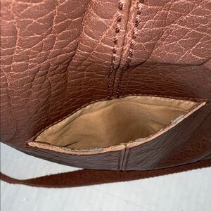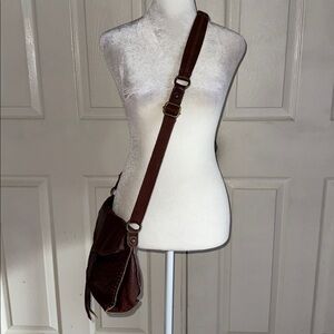 The Sak Silverlake brown leather flap crossbody bag. Exterior back pocket. Interior zipper and slip in pockets. Zipper pocket fold over flap. Brass stud detail. Adjustable leather and woven shoulder strap. Approximately 10 3/4” x 10” x 3 1/8”. Good pre owned condition