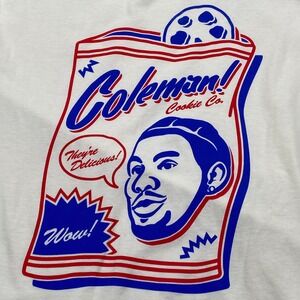 Keon Coleman Cookie Co oversized t shirt in a faded white color. Features a vibrant graphic print on the front depicting a chip bag design with 'Coleman Cookie Co' branding, a portrait of Keon Coleman, and text that reads 'Theyre Delicious!' and 'Wow!'. A small soccer ball peeks out from the top of the bag. The back of the shirt is plain. Includes original tag.