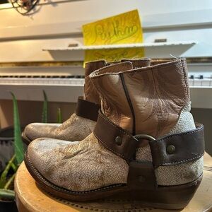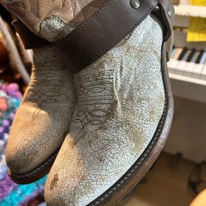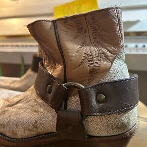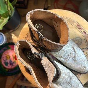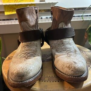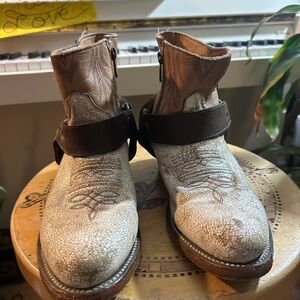 Stylish western ankle boots with a brown strap. Features a tan textured design.