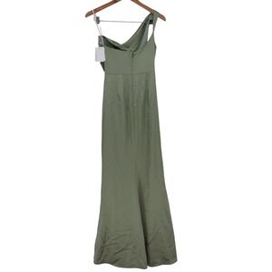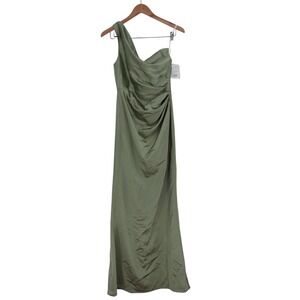 Keywords: one shoulder dress, satin gown, ruched dress, formal evening wear, bridesmaid dress, sage green dress, elegant, sophisticated, special occasion, gala dress, after six dress, prom dress, formal attire