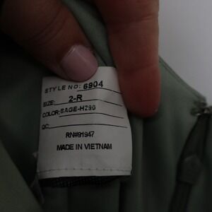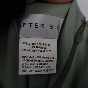 An elegant sage green formal gown by After Six. This dress features a flattering one-shoulder neckline and intricate ruching detail down the side for a sophisticated silhouette. The satin fabric drapes beautifully, creating a fluid and graceful look. Perfect for weddings, galas, or any formal evening event.
