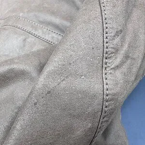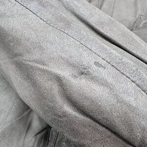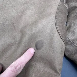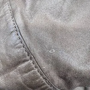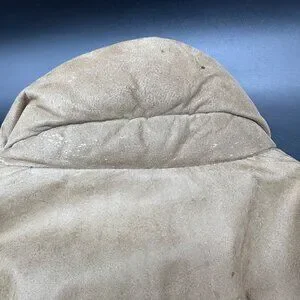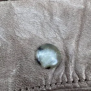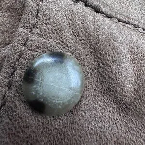 Minor wear on leather consistent with age; no rips or tears; several small stains throughout. Plastic buttons have some wear and tear.