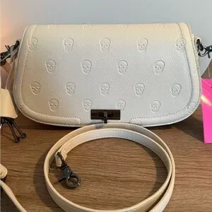 BETSEY JOHNSON Satchel/Crossbody - Love the spirit of this bag … functional yet eye catching! This bag has removable 10” handle AND crossbody strap allowing for hands free wear. The bag has subtle skull designs and dark metal accents. Gorgeous bag measures 6 1/2” T x 12” W x 3” Deep.
