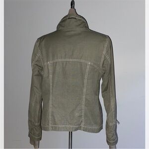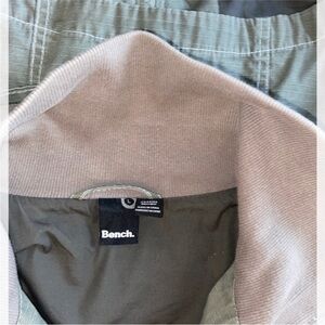 Chic khaki green jacket by Bench. Features a tall collar and sleek zip pockets.