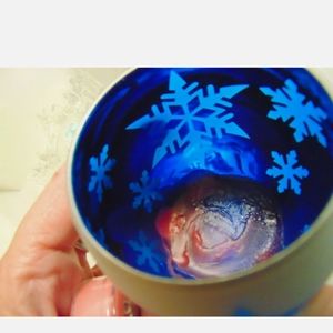 Keywords: snowflake décor, winter décor, holiday décor, cobalt glass, clear glass, tealight holder, glass candle holder, PartyLite décor, collectible glass, cozy home, cottagecore, Scandinavian décor, boxed gift item