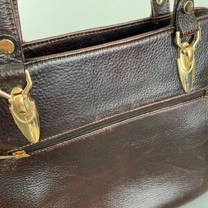 Features multiple interior compartments along with elegant gold-tone hardware accents. Its rich color and textured finish make it a perfect accessory for both professional settings and casual outings.
