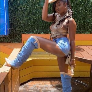 Stylish over the knee boots. Vibrant blue color. Perfect for a bold look.