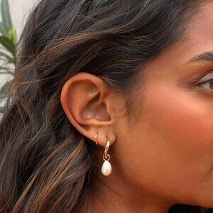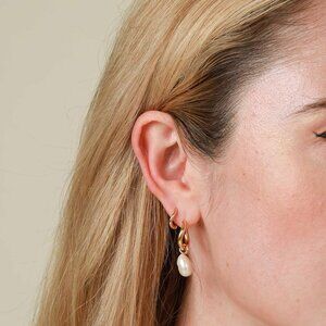 Trendy gold pearl hoop earrings for women 14K plated huggie drop wedding jewelry