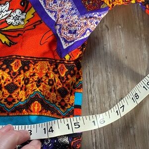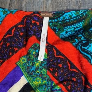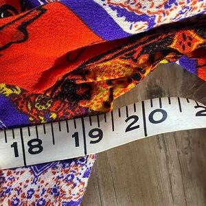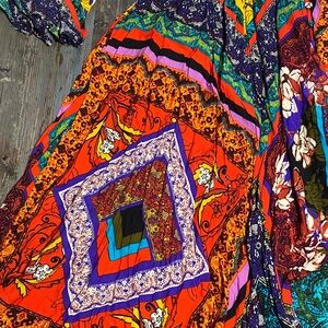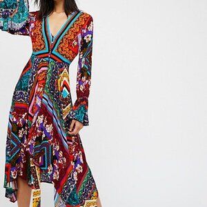 What a dress! Super vibrant retro styled long sleeve maxi dress from Free People with their signature bohemian flair. Features a mix of red, purple, and blue patterns. Eye-catching and stylish with covered buttons and a handkerchief hemline. 100% rayon, worn exactly once and in pristine condition.