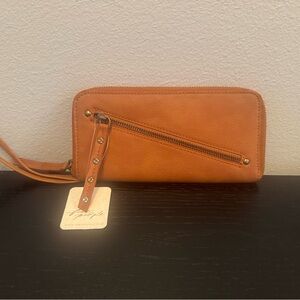 Free People zip-around wallet in brown vegan leather. Features a diagonal exterior zip pocket, removable wrist strap, and organized interior with card slots and zip coin compartment. New with original tags. Stylish and functional for everyday use or travel.