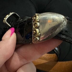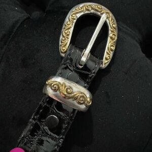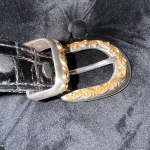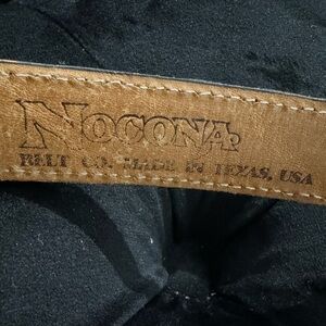 Vintage Nocona Scrollwork Black Leather Belt Silver & Gold Made in USA Texas 30”. A beautiful vintage belt! Some wear to the silver on the belt and front loops of leather as shown in photos but otherwise great vintage condition. Easy to dress up or down. Looks very similar to Brighton belts that are much more expensive.