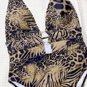 Swim Chiccia Leopard Print Plunge Neck Sexy Backless Swimsuit, Festival Boho