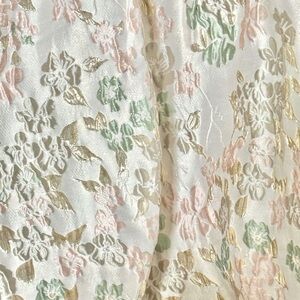 Elegant strapless dress with pastel floral pattern. Features soft pink, green, and gold hues.