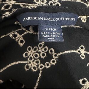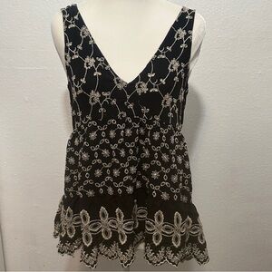 Chic black blouse with tan floral embroidery. Sleeveless design with a V-neckline. Perfect for casual or formal occasions.
