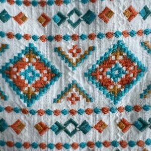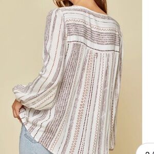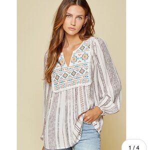 Mocha stripes print pretty blouse with Aztec turquoise embroidery bib. round collar, V split neckline, babydoll style, elastic wrist, long sleeves. Small crochet detail around bib. Semi sheer, woven. So pretty!