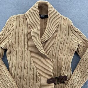 Lauren Ralph Lauren Sweater Womens Medium Beige Cable Knit Wrap Belted Cotton