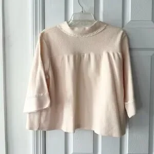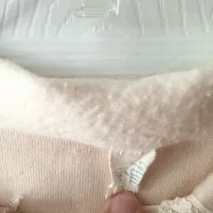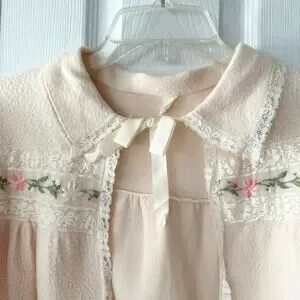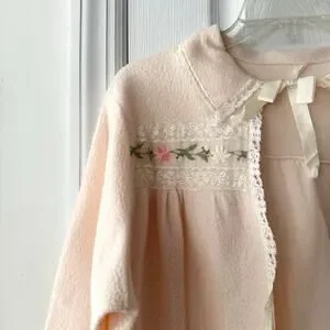 Missing size tag but can best fit a size small or medium. Missing full brand tag only partially still attached. Peach pink fleece collared bed jacket. Cropped length. Lace trim throughout. Ribbon tie at neckline. Floral Trim across chest. Feminine coquette cozy cottage. Vintage 50s 60s era. Light pilling. Preowned in good condition with no stains or tears.