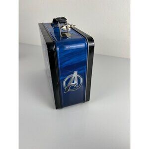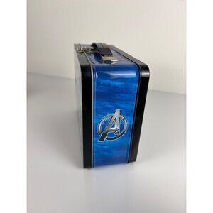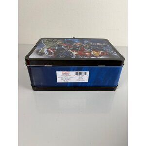 This Marvel Avengers metal lunchbox features a durable design with vibrant character graphics, a sturdy handle, and a secure latch closure.
