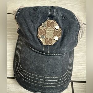 Brand new Gucci upcycled hat. Stylish Gucci upcycled baseball cap. Features mesh back. Iconic Gucci logo patch on front.