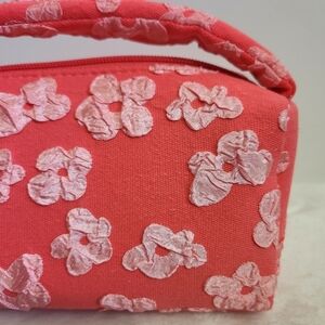 NWT Ulta Beauty Coral Pink Floral Flower Appliques Cosmetic Bag. Perfect for everyday use! Top zip closure, top handle for easy carrying, lightweight, lined interior for easy cleaning. Approximately measures 7.5" x 3.5" x 3.5". Brand new with tags!
