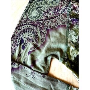 The One World Green Multi Velvet Top is a whimsical and boho-inspired blouse designed for women in size large. This top features a beautiful embroidered design on a green and purple velvet fabric, with flared sleeves that add a touch of flair to the overall look. Perfect for those who embrace the unique and creative, this top is a statement piece that can be styled in various ways to suit different outfits and occasions. Ideal for those who appreciate a blend of elegance and bohemian style in their wardrobe.