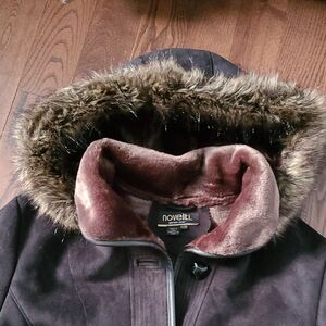 Jacket faux suede style in black in the picture the jacket look dark brown but the exterior is black and the inside is dark brown