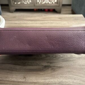 Chic and versatile crossbody bag. Features rich purple leather. Gold-tone logo accent. Perfect for day or night.