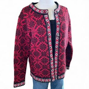 L.L. Bean Red and Black Patterned Merino Wool Cardigan