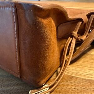 Elegant brown leather shoulder bag with chain strap along with longer leather strap. Gorgeous expensive bag. Does have signs of use (last photos). Some rubbing on the suede side paneling where it sits on the bottom and some very light pen marks inside top next to zipper. Otherwise very clean and GORGEOUS. Non smoking home.