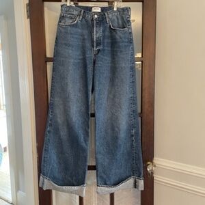 Stylish wide leg jeans. Classic blue denim. Perfect for casual wear.