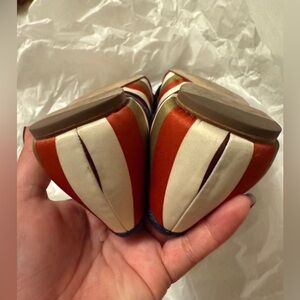 Chic Coach flats with a colorful striped pattern. Features a stylish bow accent. Perfect for casual elegance.