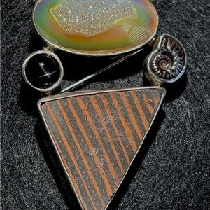 Artisan Silver Druzy Quartz + Black Star Diopside + Ammonite Fossil Pendant/Pin