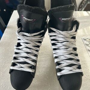 Really nice condition- look as if never worn- Bauer Impact 200 Senior ice skates in black and white. Perfect for skating enthusiasts. Size 8 R