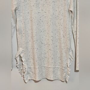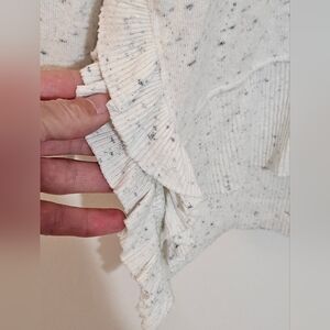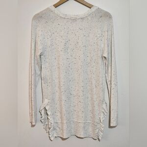Anthropologie Postmark Blue & White Sweater Womens XS Gia Lightweight Ruffled Layering Brushed Soft Fleece. EUC. This womens sweater is super soft (feels almost like cashmere) and is a speckled/heather blue & on a white background. It has a deep v-neck with long sleeves, is oversized, and the hemline is shorter in the front than the back. The hemline is feminine with a ruffle detail and side slits. The sweater is oversized in general. 75% Rayon 21% Polyester 4% Spandex. Hand wash cold and lay flat to dry. Preloved and in excellent condition. Please look at all the pictures closely and ask questions before purchasing. **BUNDLE MULTIPLE ITEMS FOR SAVINGS. Nonsmoking home. Thank you.