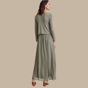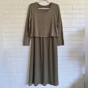 Like new! This dress is beautiful! A layered look with a mix of lush fabrics in one fantastically easy dress. The effect looks like a stylish pairing of separates with a long-sleeve sweater topping a flowy chiffon skirt, but a comfy jersey knit tank dress hidden underneath effortlessly pulls it all together. Hidden elastic waist.