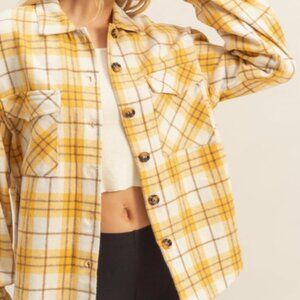 Make this season a groovy one with this flannel ! Covered in a plaid print, this shacket has a collared neckline and a drop shoulder. The slightly oversized bodice has two front flap pockets and a functional button placket down the center.