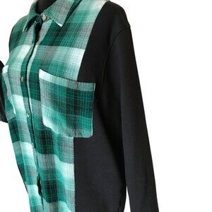 Upcycled shirt jacket, women's size medium. This pretty green plaid button-down sweatshirt brings an edgy, lived-in look with all the cozy comfort you want. A black sweatshirt base has been spliced with a plaid collared shirt with 2 front pockets and a partial fringy hem. Perfect for campus days, concerts, or staying warm in effortless grunge style.