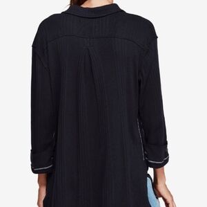 A subtle, contrast stitching and exposed seams add custom character to this ribbed, v-neck top. Clean up your look with the sleek styling of this Free People Annie Long Sleeve. Light and drapey fabrication features a textured ribbed detail. Relaxed spread collar. Single-button closure at the placket. Long sleeves. Inverted pleat at back yoke. Straight hemline with dramatic side vents. 60% cotton 40% polyester.