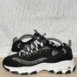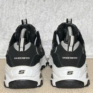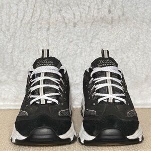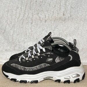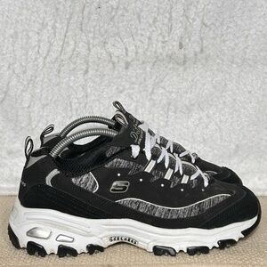Skechers D'Lites Womens Black/White Me Time Leather/Textile Sneakers Shoes. Color: Black/White. Pre-owned Condition – refer to pictures for description of shoes No rips or tears. Smoke free.