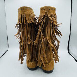 Rampage Shoes Womens Size 8.5 M Cognac Moccasin Leather Boots Fringed Slip On